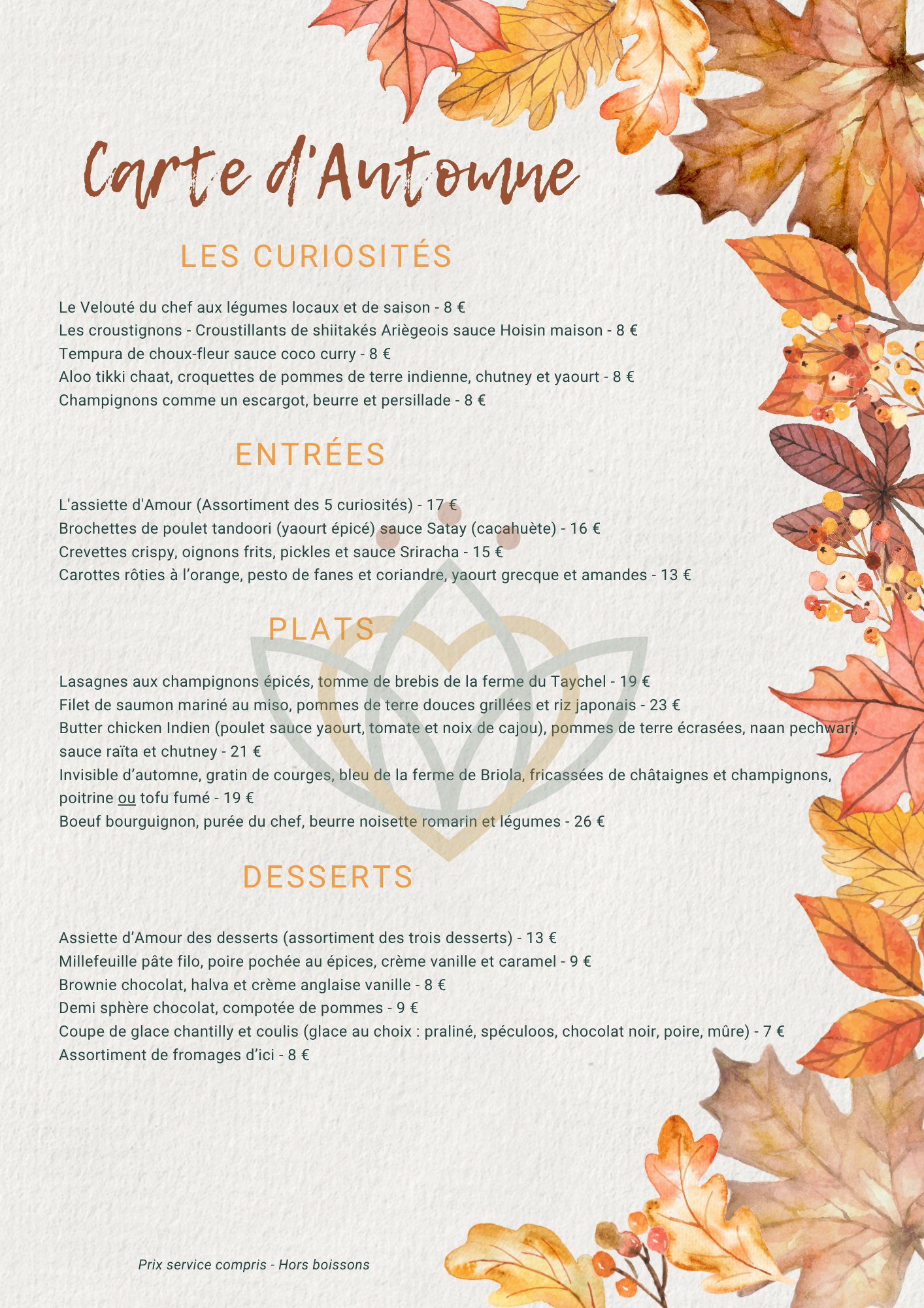 Nos propositions sont variables en fonction des arrivages, mais notre carte contient toujours plusieurs entrées, plats et desserts;